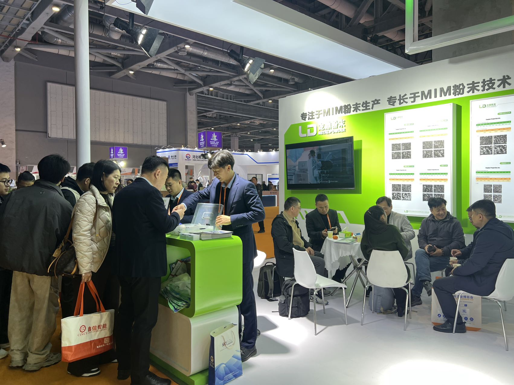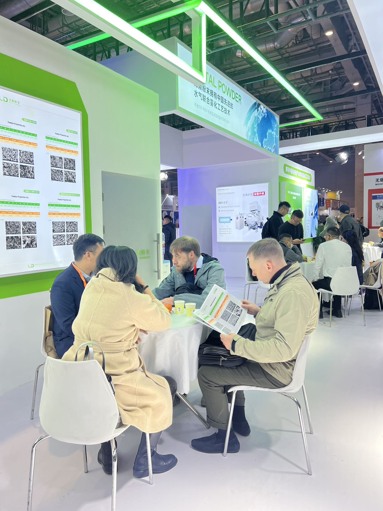 展位內(nèi)設(shè)置了多輪商務(wù)洽談環(huán)節(jié),客戶與技術(shù)團(tuán)隊(duì)圍坐交流,圍繞 MIM 粉末的選型、工藝優(yōu)化、量產(chǎn)適配等核心問(wèn)題展開(kāi)深入探討,現(xiàn)場(chǎng)合作意向滿滿。