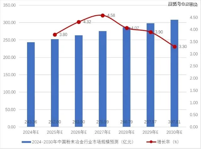 目前,粉末冶金技術(shù)已經(jīng)被廣泛應(yīng)用于交通、機(jī)械、電子、航空航天、兵器、生物、5G通訊和新能源等領(lǐng)域。隨著這些領(lǐng)域?qū)Ψ勰┮苯甬a(chǎn)品的需求逐漸增大,金屬粉末的需求預(yù)計(jì)將會在未來十年快速增長,預(yù)計(jì)2024-2030年中國粉末冶金行業(yè)市場規(guī)模平穩(wěn)上升,到2030年中國粉末冶金行業(yè)市場規(guī)模將達(dá)到307.81億元。